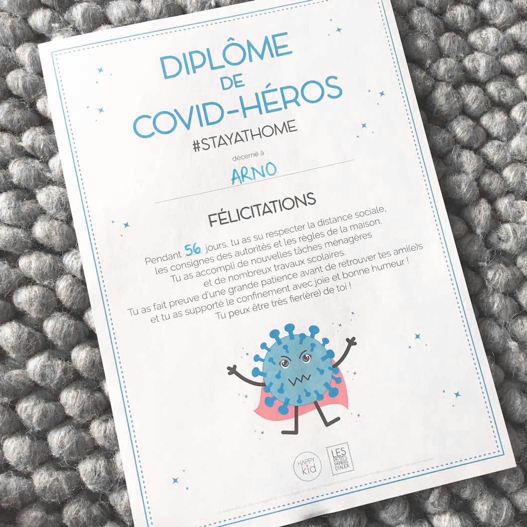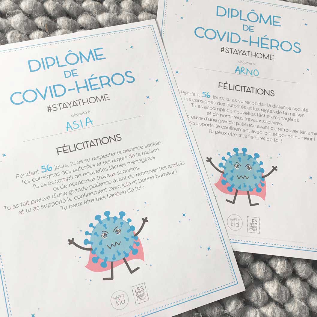 Isabella de HappyKid.ch, a croisé sur la toile une idée pour féliciter nos Minus après 56 jours de confinement total et déjà 7 jours de semi-confinement avec un petit peu d’école en demi-journée. En effet, une nounou en France a réalisé des Diplômes de Héros pour les kids et nous nous sommes dit que nous pourrions associer HappyKid et Les Petits Papiers d’Alex pour une version de ce Diplôme de Covid-Héros qui serait téléchargeable et accessible pour tous.