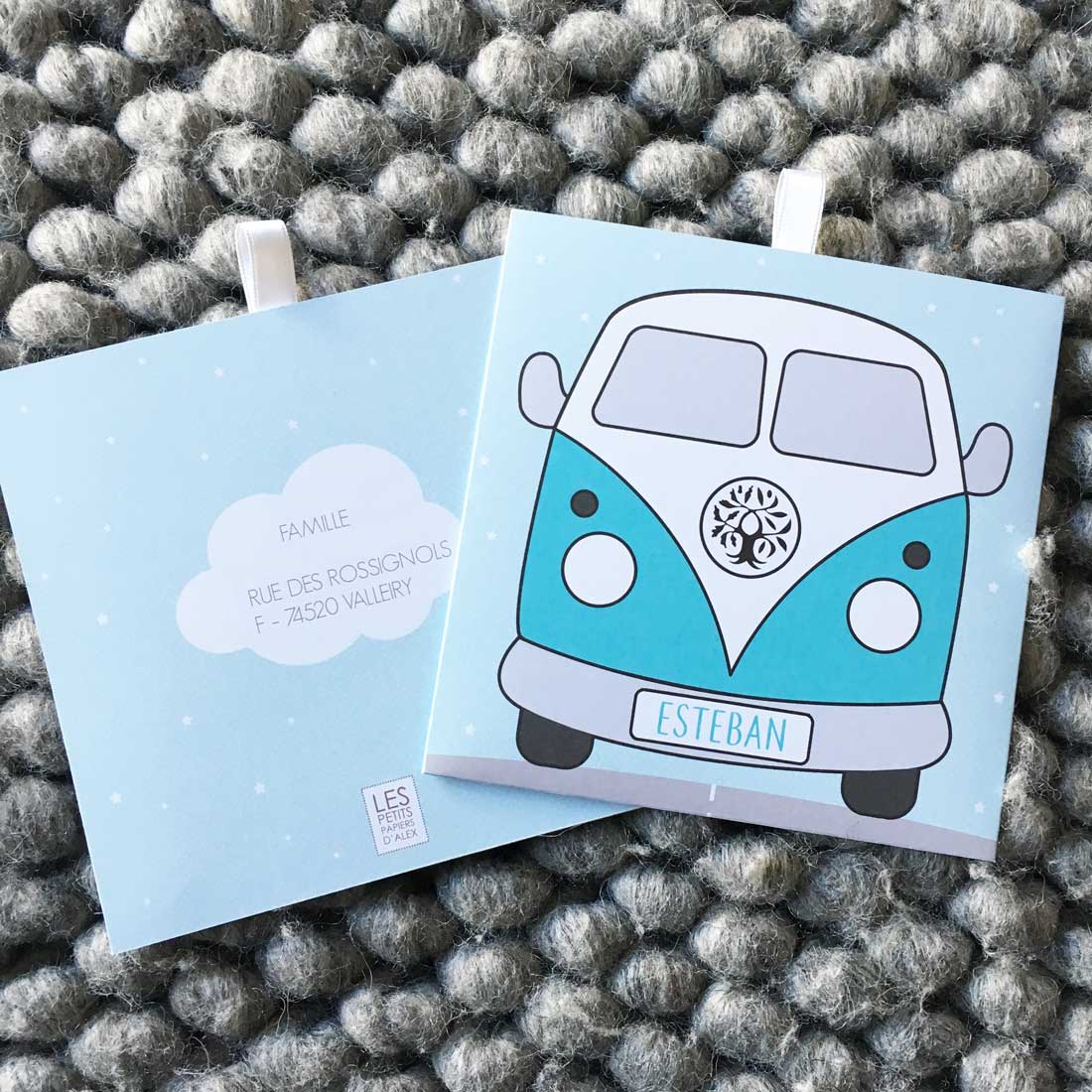 FAIRE-PART COMPOSÉ D’UNE CARTE DOUBLE RECTO-VERSO ATTACHÉE AVEC UN RUBAN DE SATIN ET GLISSÉE VERTICALEMENT DANS UNE POCHETTE AU NOM DE L’ENFANT
