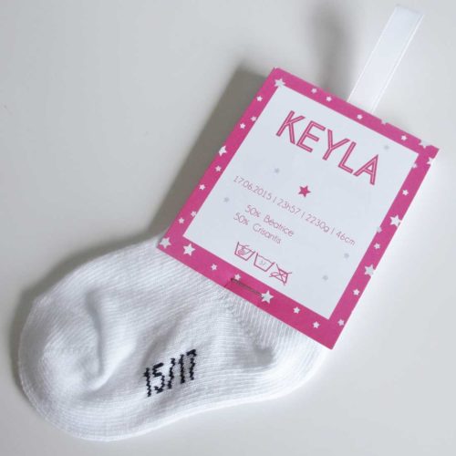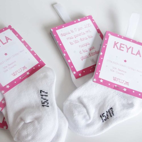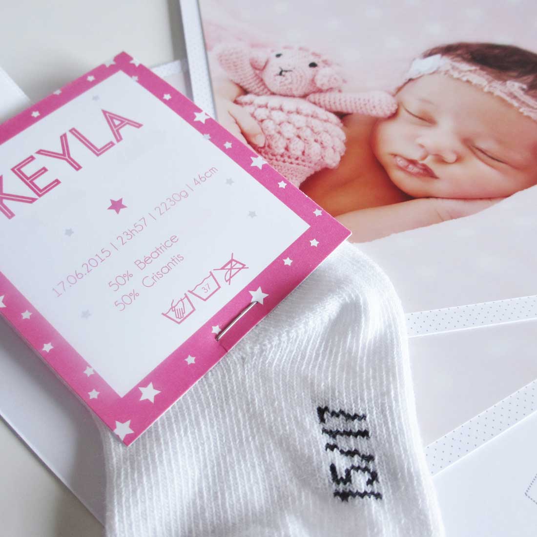 FAIRE-PART COMPOSÉ D’UNE CHAUSSETTE ET D’UNE ÉTIQUETTE AVEC UN RUBAN DE SATIN ET D’UNE CARTE SIMPLE SÉPARÉE AVEC LA PHOTO DE L’ENFANT