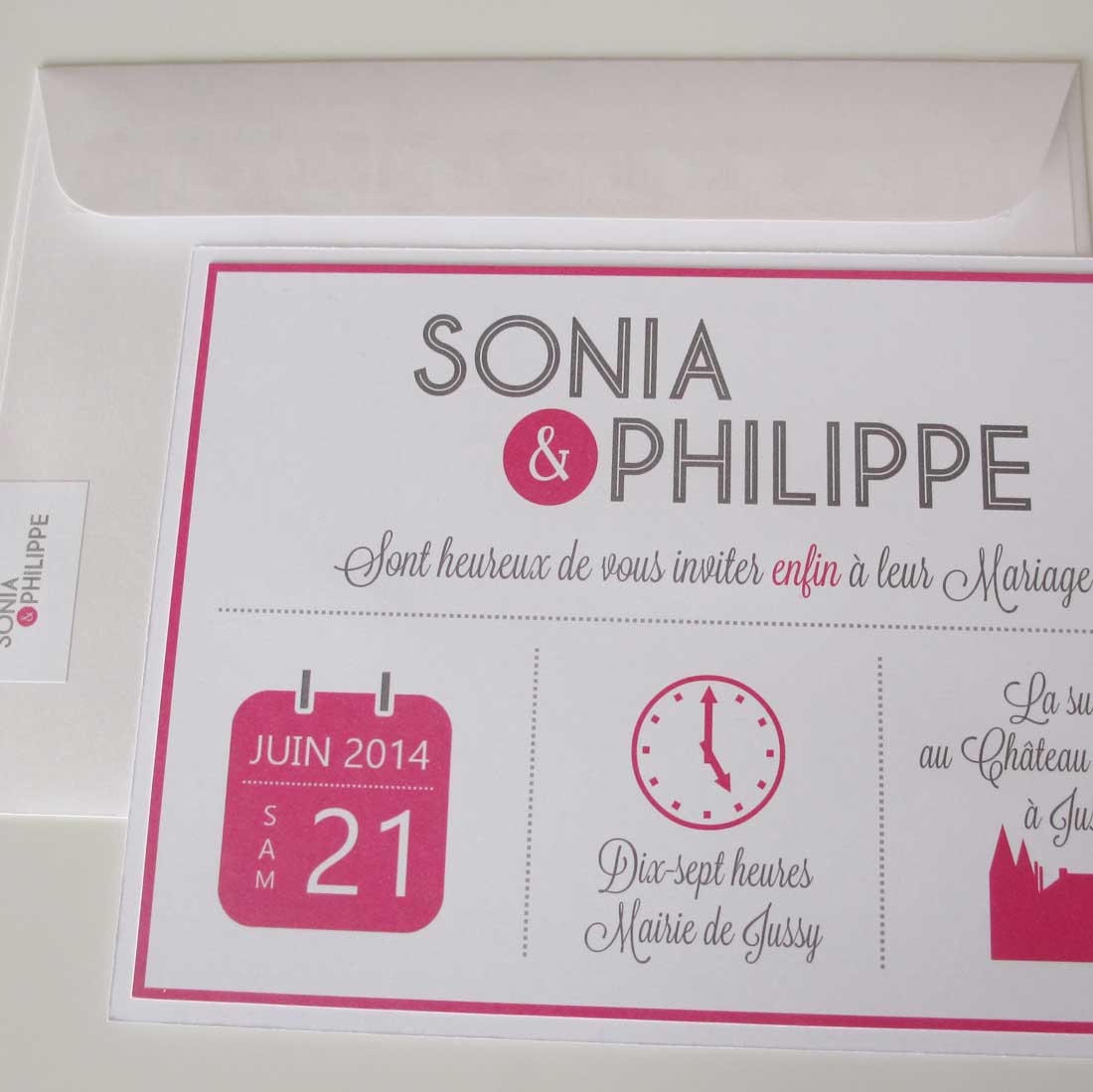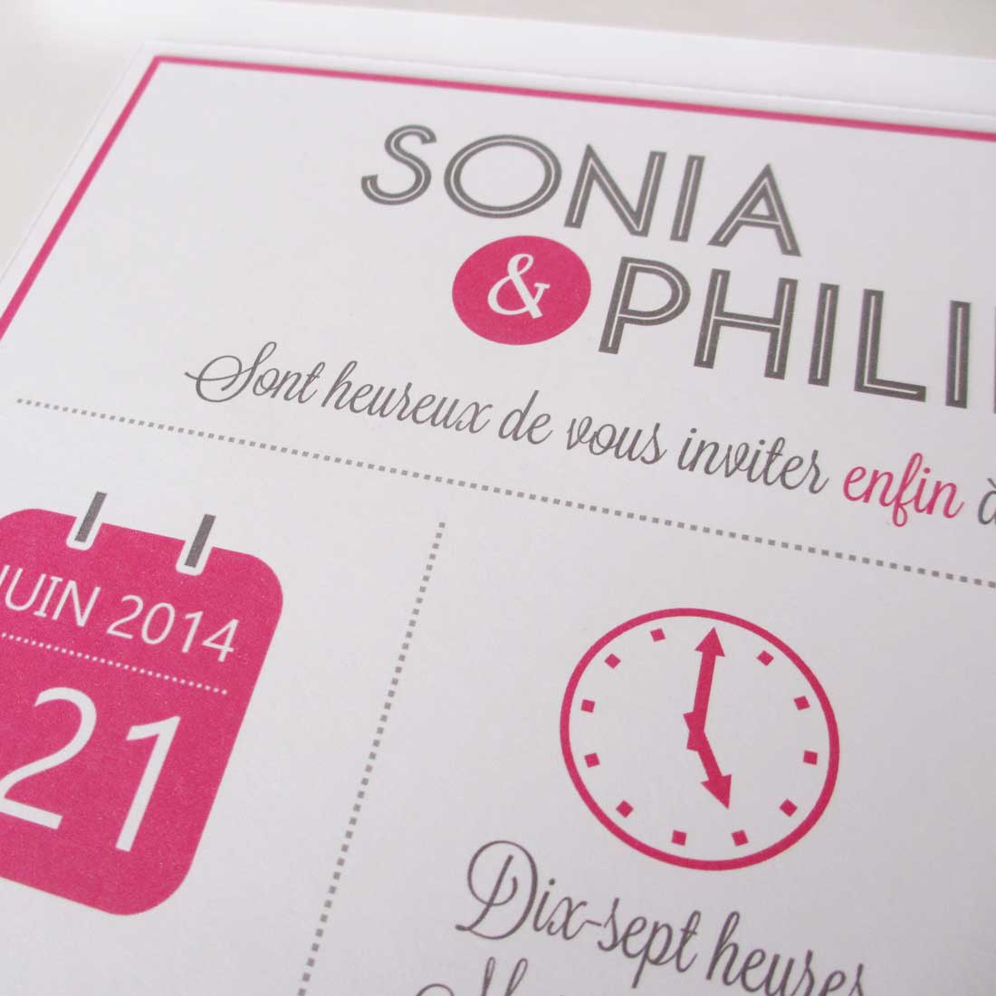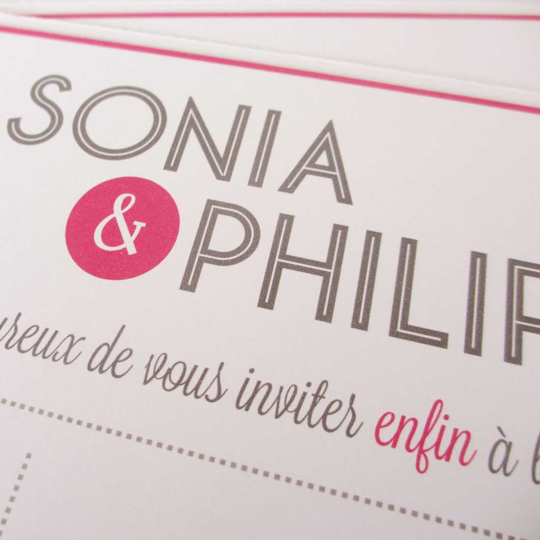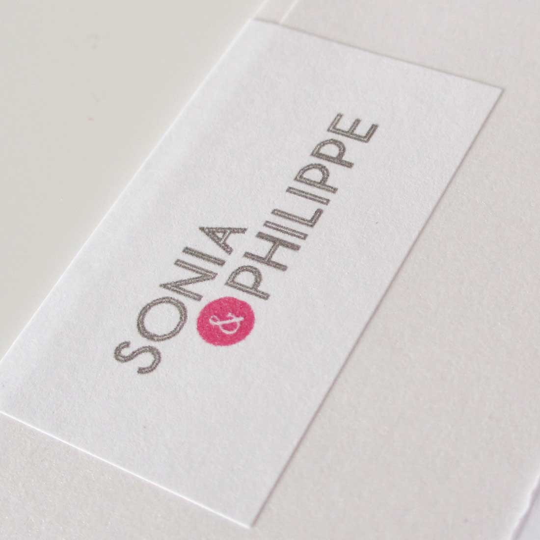Sonia & Philippe CARTE SIMPLE FORMAT A5 IMPRESSION JET D'ENCRE SUR PAPIER 350G/M2PRIX : SUR DEMANDE Un grand merci à Sonia et Philippe de m’avoir confié la réalisation des faire-part de cet événement spécial.