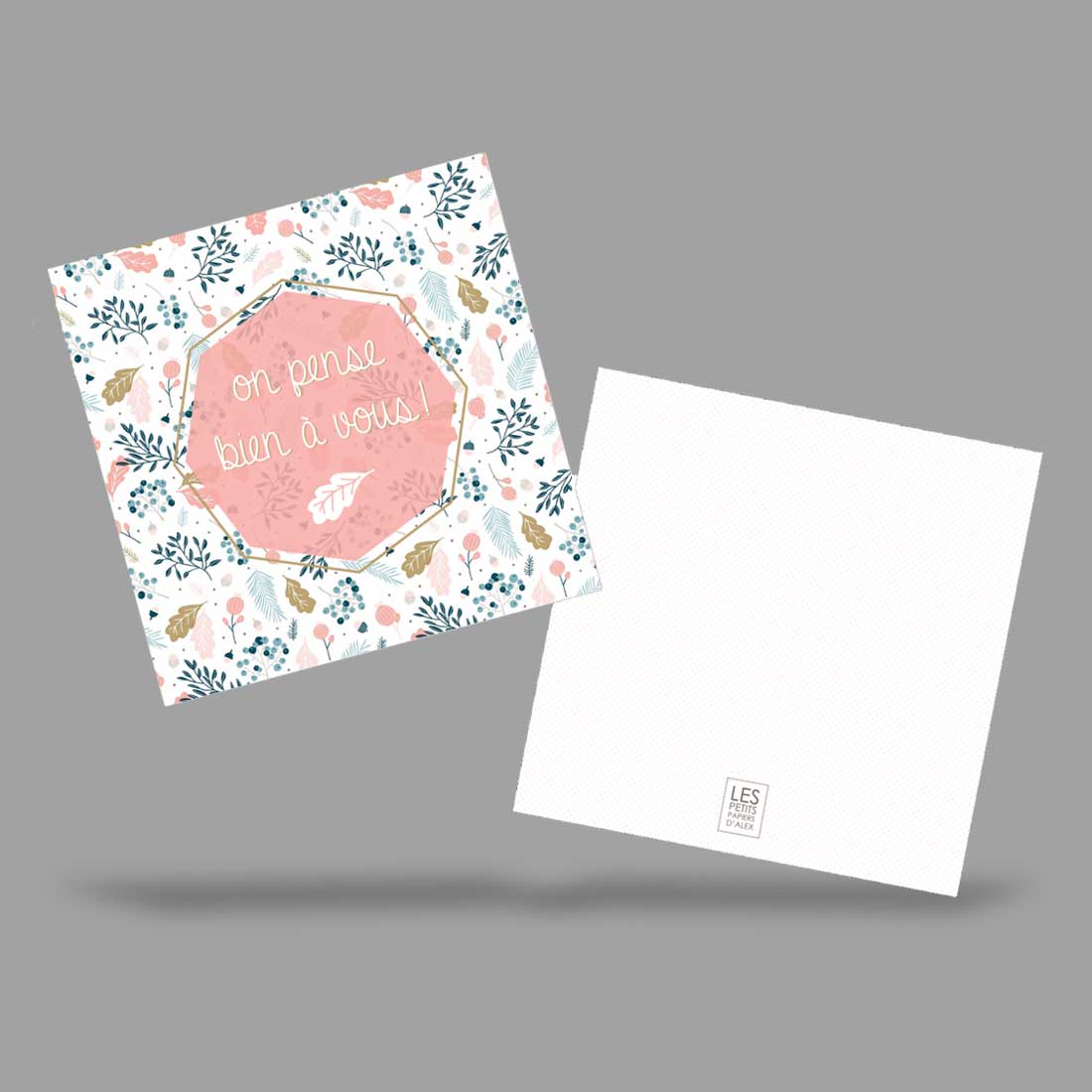 Thoughts & Flowers Prix: 4.00CHFCode produit: DIVERS011CARTE DOUBLE FORMAT CARRÉ 14X14CMIMPRESSION JET D'ENCRE SUR PAPIER 350G/M2ENVELOPPE INCLUSE