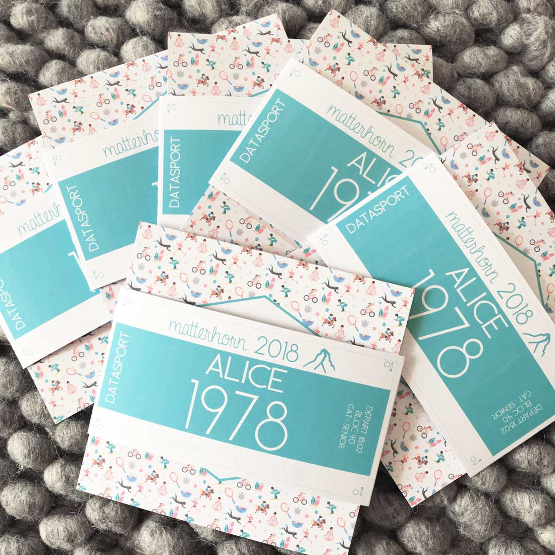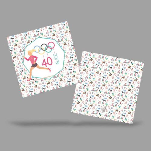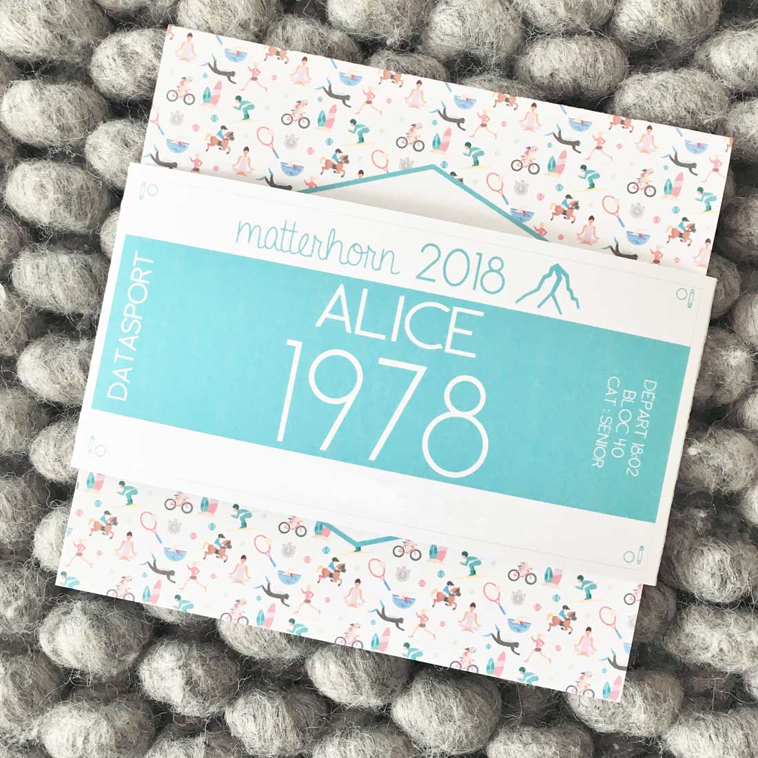 CARTE DOUBLE PLIÉE VERTICALEMENT FORMAT CARRÉ 14X14CM + LIEN EN FORME DE DOSSARD + DÉTAILS À L'INTÉRIEUR